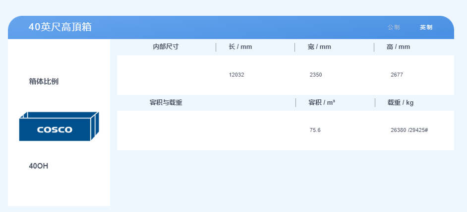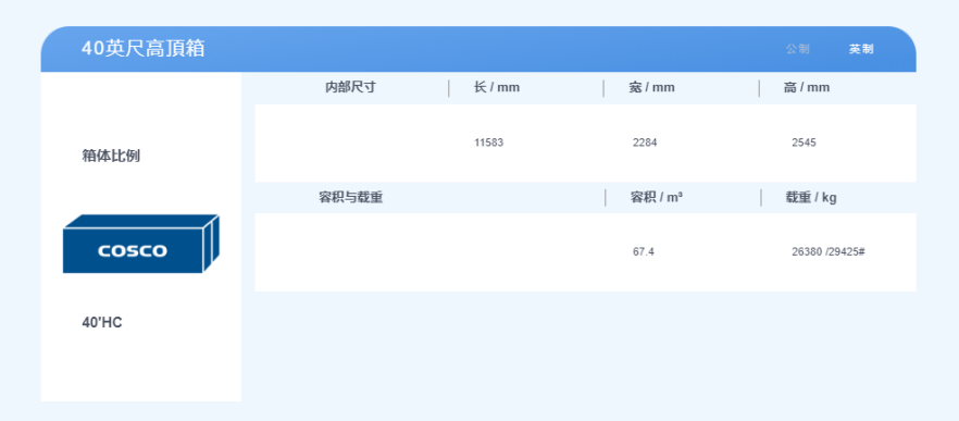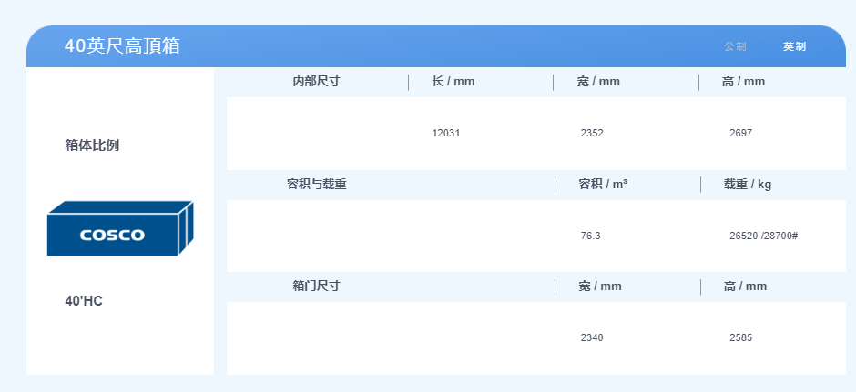 40英尺集裝箱,體積是2.3米寬,2.3米高,12米長,最大貨物載重約28噸。