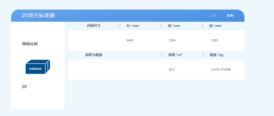 特別備注:最大貨物載重可能會(huì)根據(jù)每個(gè)國家的交通道路法而有所不同,當(dāng)實(shí)際運(yùn)輸貨物時(shí),需查看貨運(yùn)運(yùn)輸涉及地區(qū)的交通道路法。單位換算進(jìn)制數(shù)字會(huì)有細(xì)小的差別,實(shí)際操作中同規(guī)類型標(biāo)準(zhǔn)集裝箱的尺寸差別不大。